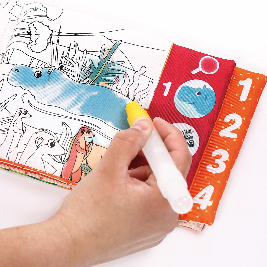 En passant le crayon à eau, Bébé révèle des animaux et des décors colorés. Cette activité développe l’observation et le plaisir de découvrir.