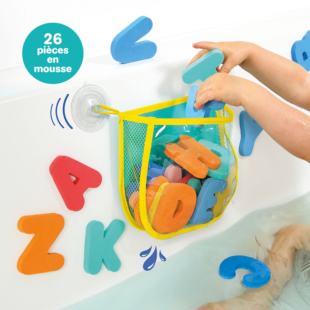 Alphabet de bain en mousse EVA (26 lettres) à coller sur parois mouillées. Inclus : sac filet avec 2 ventouses pour rangement et séchage rapide. Lettres 7,5 cm. Idéal pour l’éveil et la motricité fine dès 10 mois.