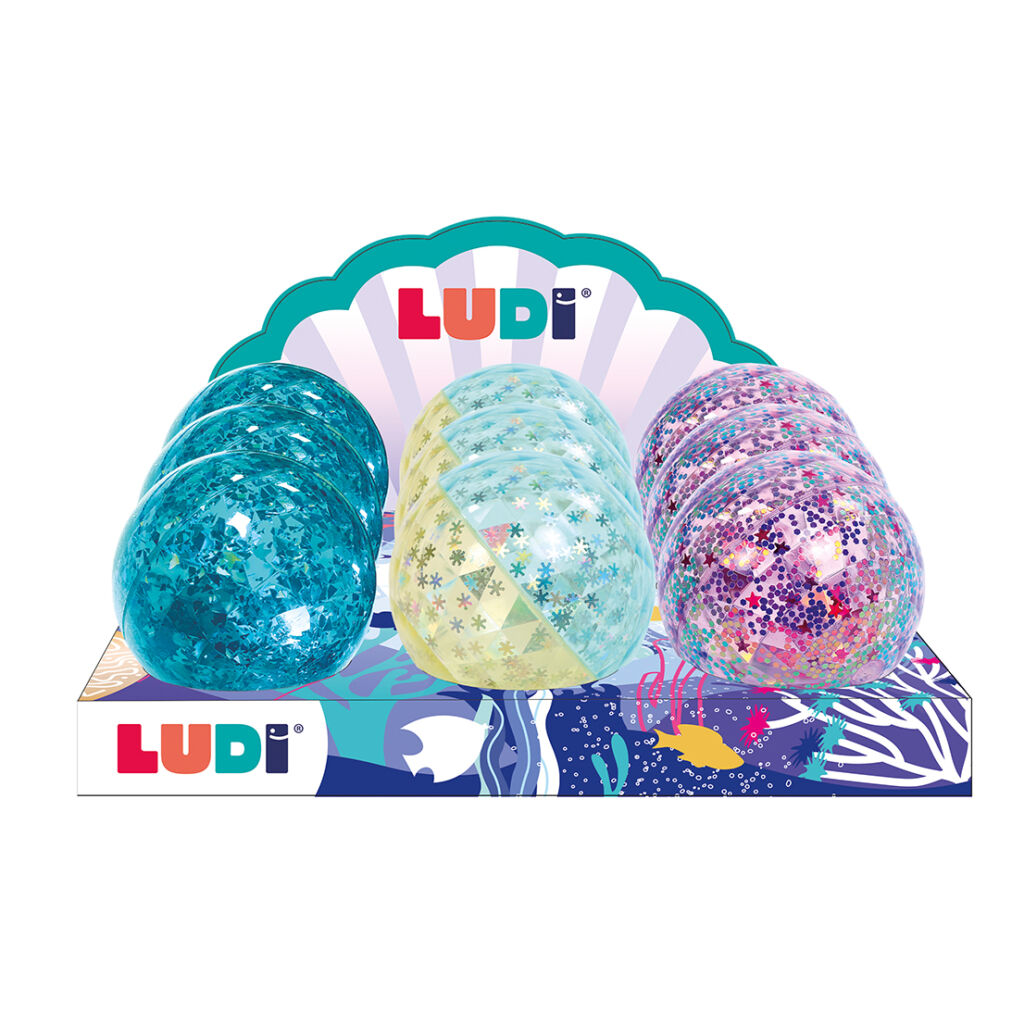 Disponibles en violet, bleu et bleu clair / jaune, ces balles translucides captent la lumière à chaque mouvement. Les paillettes intégrées à la surface créent un effet visuel immédiat qui stimule l’attention et la curiosité de bébé.