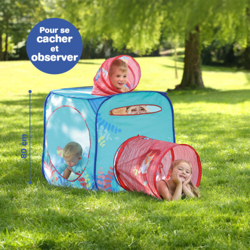 Cube explorateur pop-up enfant avec cube 80 x 80 cm, tunnel droit et tunnel en coude. Structure légère et modulable avec sac de transport inclus, idéale pour stimuler l’imagination, la motricité et le jeu actif dès 2 ans.