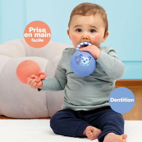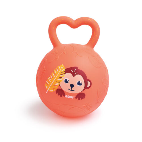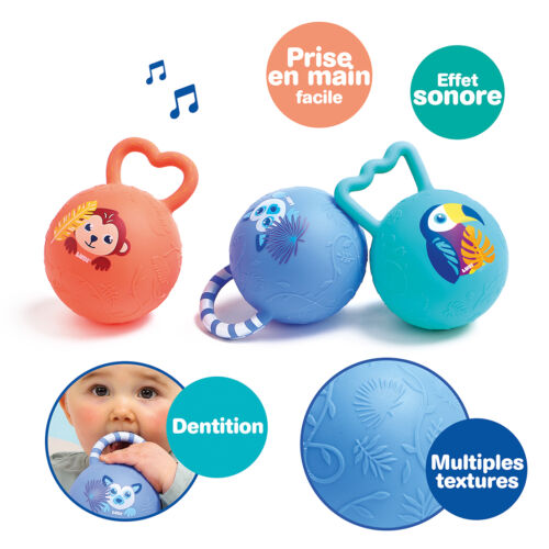 Hochet balle souple et texturé avec grelot intégré. Surface à reliefs tactiles et motifs animaux (singe, perroquet, lémurien). En 100 % PVC, idéal pour la motricité fine et les poussées dentaires dès 3 mois.