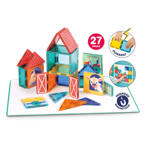 Le coffret comprend un grand panneau magnétique blanc sur lequel les enfants peuvent fixer librement les 27 pièces aimantées. Ces pièces, de formes et de tailles variées, permettent de reproduire des scènes à plat ou d’imaginer des constructions en volume, comme une étable, un champ ou même un enclos pour animaux. De quoi stimuler l’imagination et la motricité fine !
