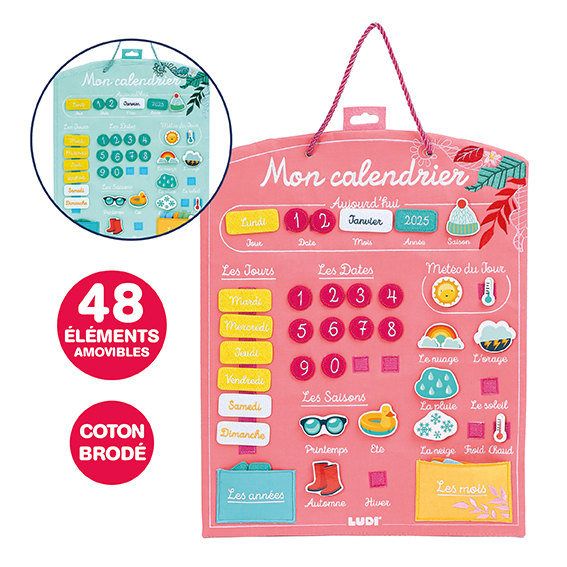 Ce calendrier mural en tissu brodé aide les enfants à comprendre et à maîtriser le passage du temps. Grâce à ses éléments amovibles en feutrine, les petits curieux pourront s’amuser à découvrir les jours de la semaine, les mois, les saisons, et même la météo du jour !
